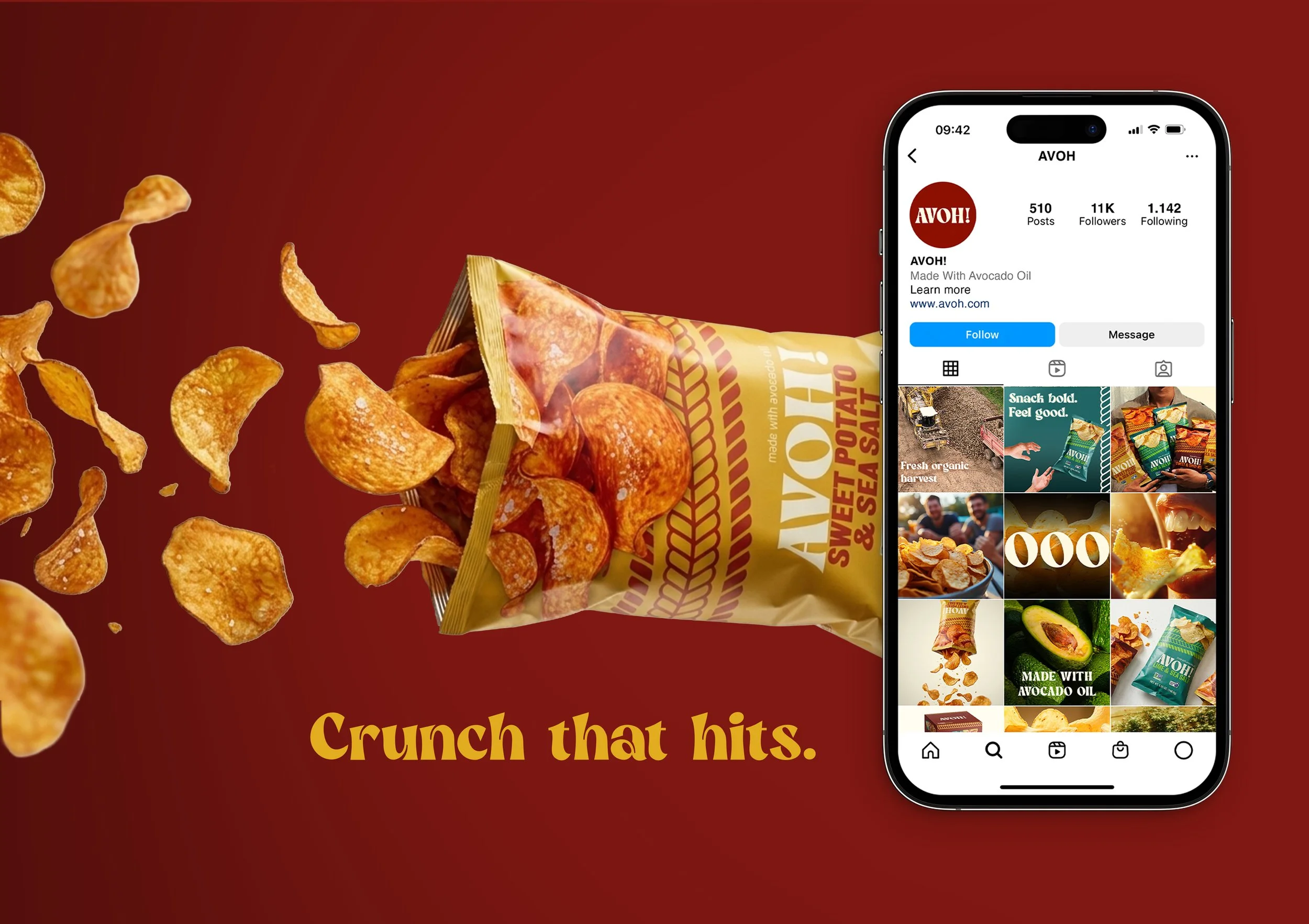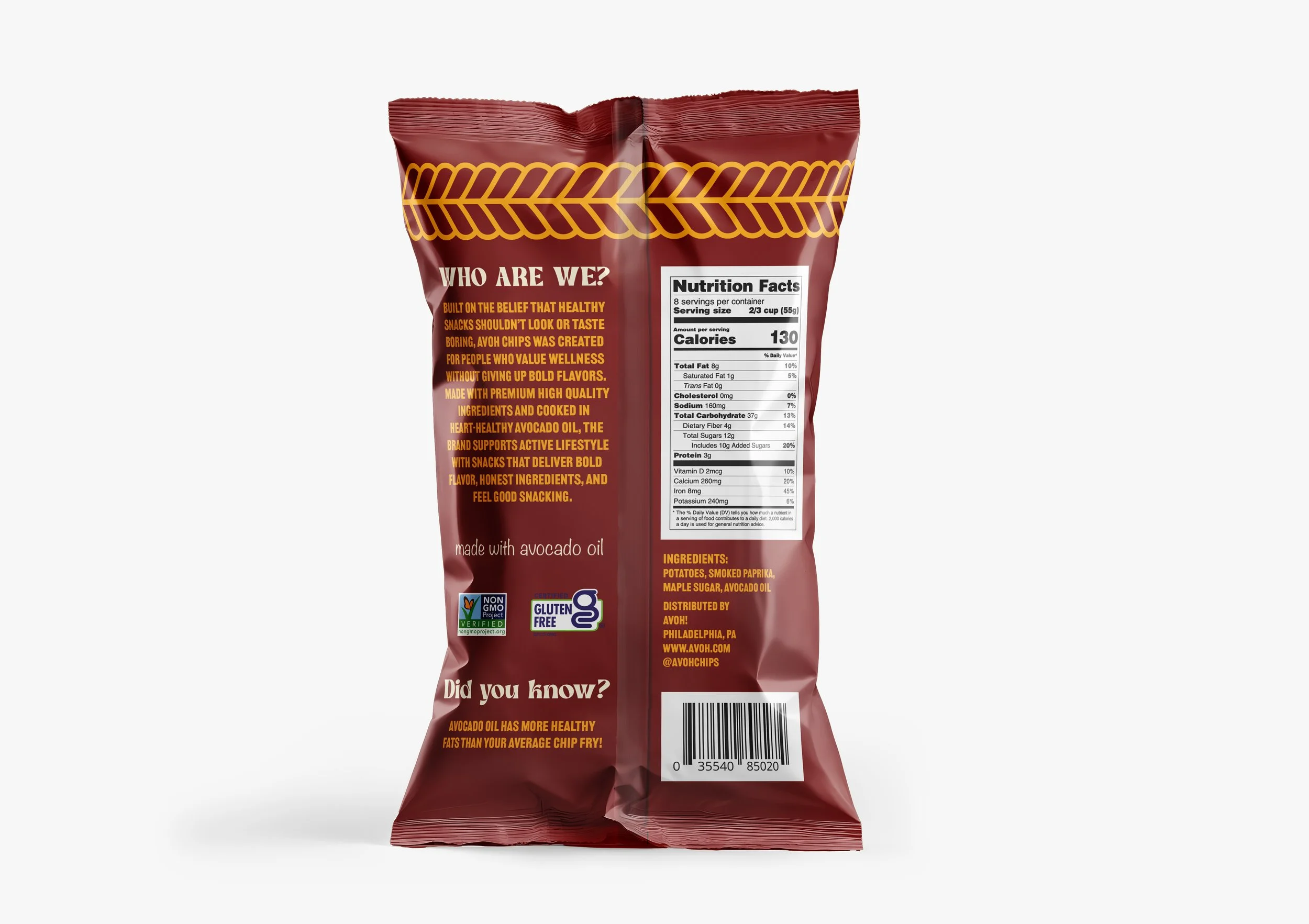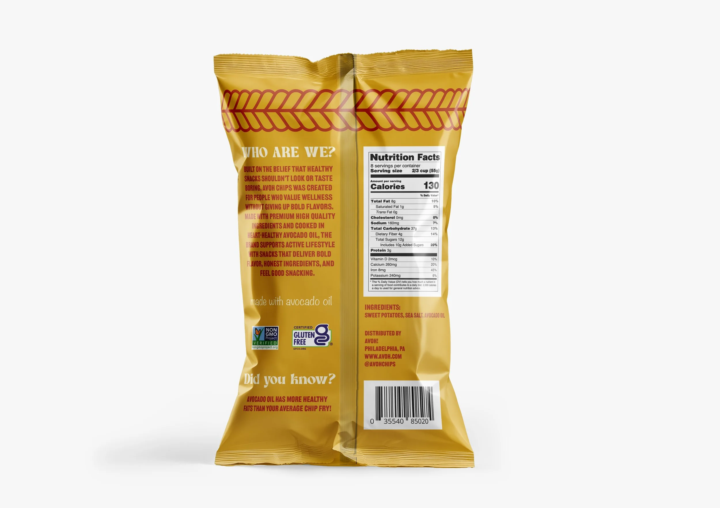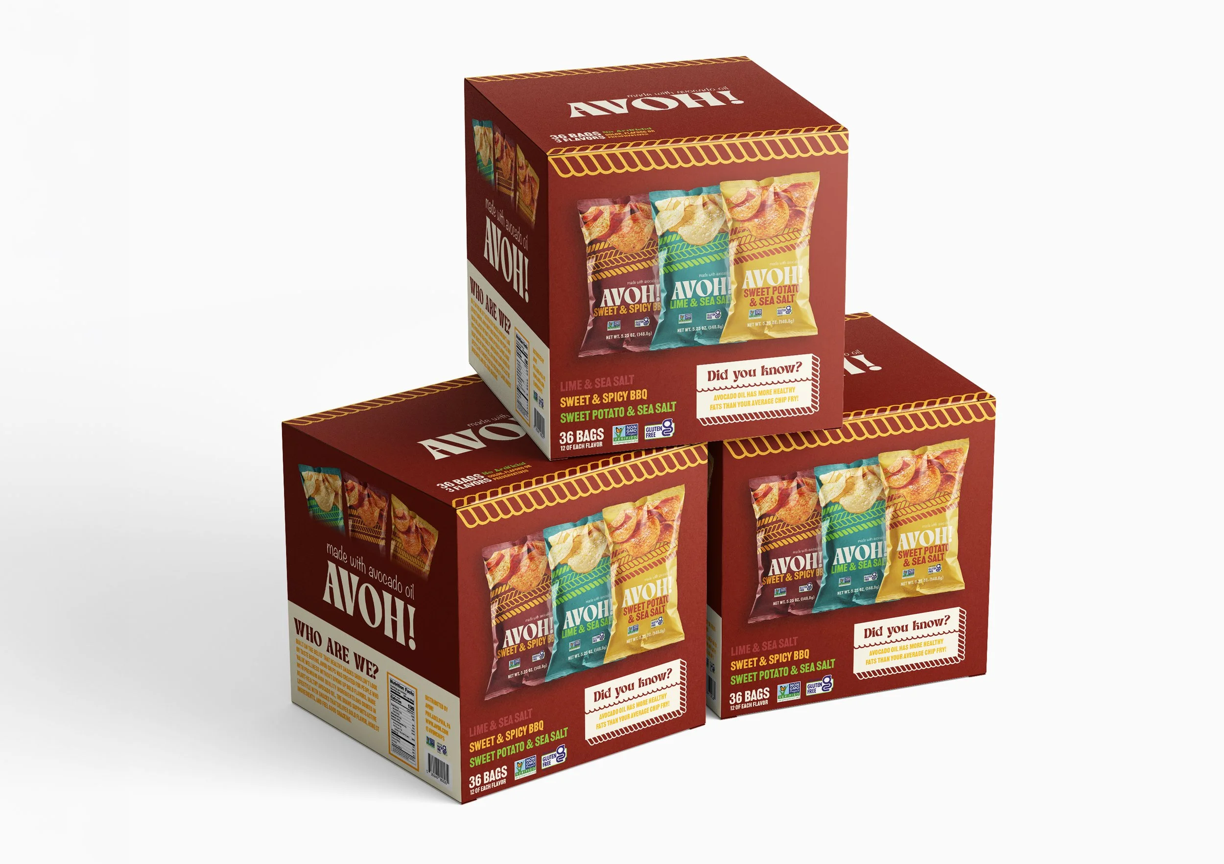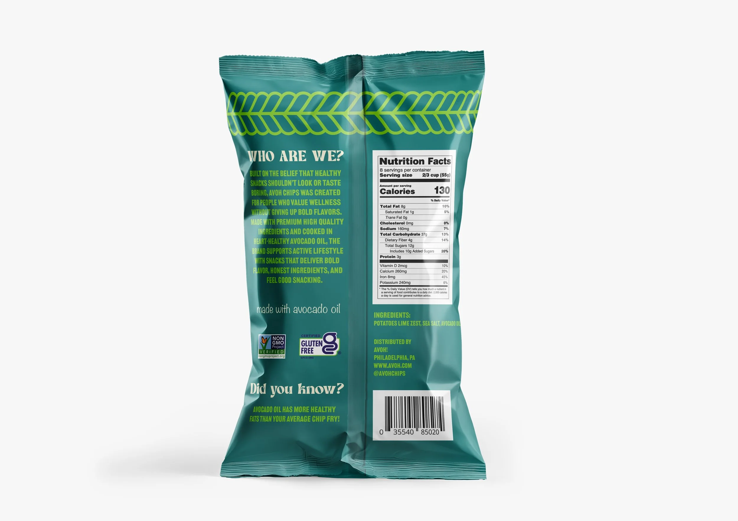 Avoh is a health-focused snack line of avocado oil-based chips, created to challenge the conventional look of “better-for-you” products. While many healthy snacks rely on muted colors and minimal design to signal wellness, Avoh uses bold typography, vibrant color palettes, and dynamic layouts to create a more engaging and memorable presence. The brand identity emphasizes the balance between health and enjoyment, using clear messaging and real ingredient imagery to communicate quality while still feeling fun and approachable. Designed to stand out on crowded shelves, Avoh demonstrates how strategic visual design can reshape expectations around healthy snacking.