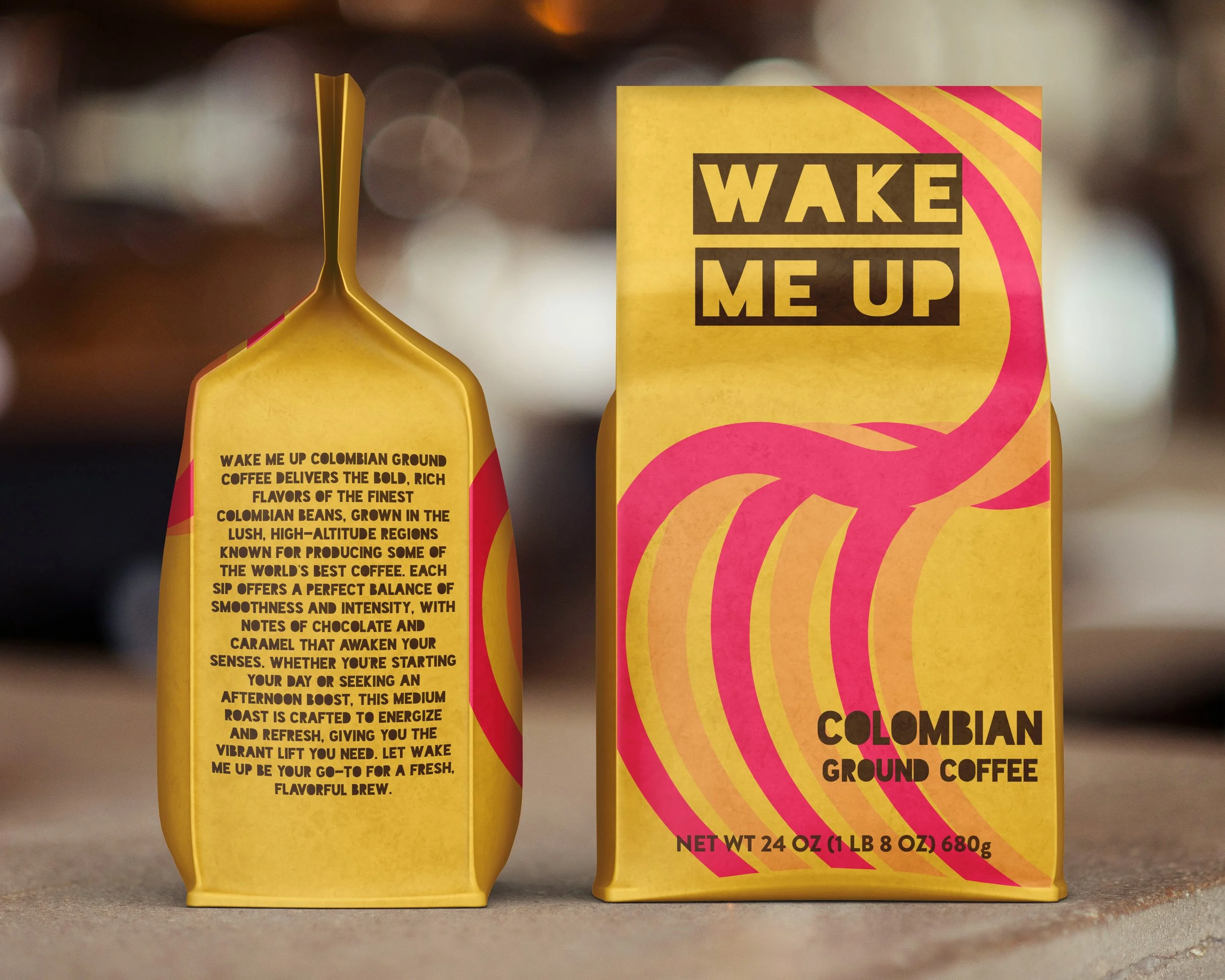 The goal of this project was to design packaging for Wake Me Up that visually communicates energy and personality while standing out on the shelf. Bold lively colors were used to create a strong presence and reinforce the stimulating nature of Colombian coffee. The design balances playful elements with clear hierarchy to keep the packaging both eye-catching and easy to read. Overall, the aim was to create a memorable coffee brand that feels vibrant, approachable, and full of character.